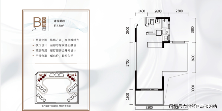 A户型:46㎡1房1厅1卫B户型:63㎡2房2厅1卫B1户型:63㎡1房2厅1卫