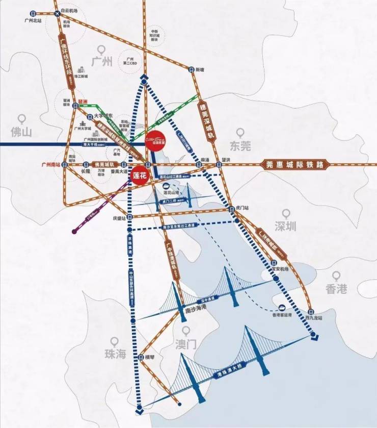 不过好在项目附近未来规划8号线莲花站换乘,建成后3站可抵达琶洲;通过佛莞城轨,3站直达长隆,4站可达广州南站。