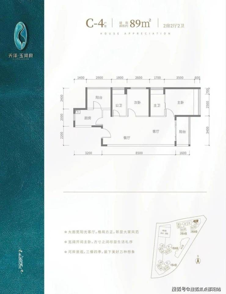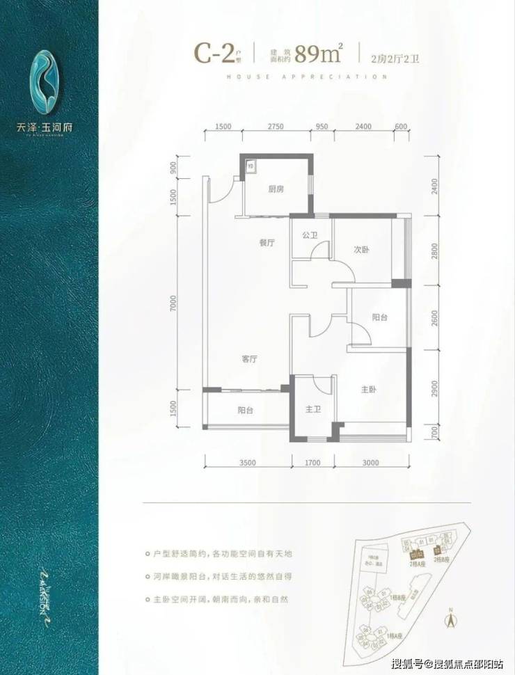 C2户型-89㎡-3房2厅2卫,2栋A座02/03,2栋B座02户型,设计的是竖厅格局,客厅3.5米开间,3个房间宽度分别为3/2.8/2.6米,公卫三段式分离,得房率:90.9%(包含赠送),阳台进深1.5米,东南朝向,看茅洲河景观。