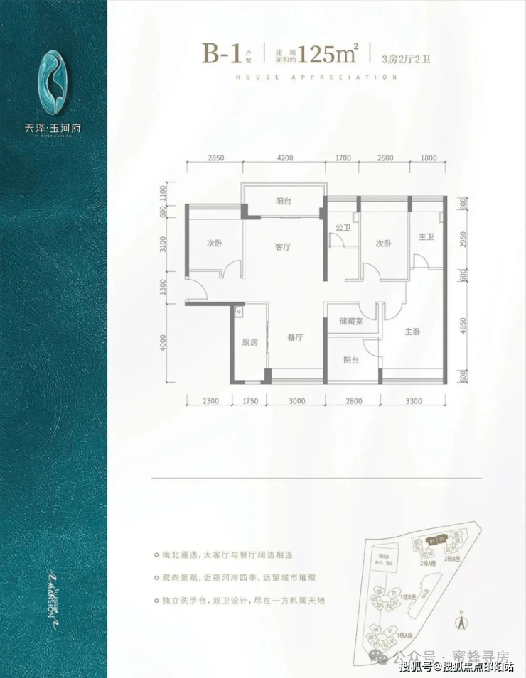 B1户型-125㎡-4房2厅2卫,设计的是竖厅南北通透格局,客厅4.2米开间,全屋飘窗设计,4个房间宽度分别为3.3/2.85/2.8/2.6米,L型厨房,得房率:91.1%(包含赠送),阳台进深1.7米,主朝西北朝向。