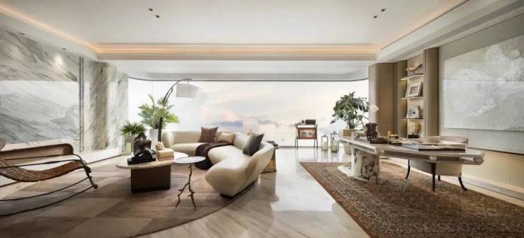 室内无转角墙柱,搭配270°全弧形玻璃,观景面显得特别敞亮通透。配备女王衣帽间 , 主卫洗手台还采用了天然奢石打造,纹理像艺术品一样独一无二,镜子、台面、台盆一体成型,好看又好打理。