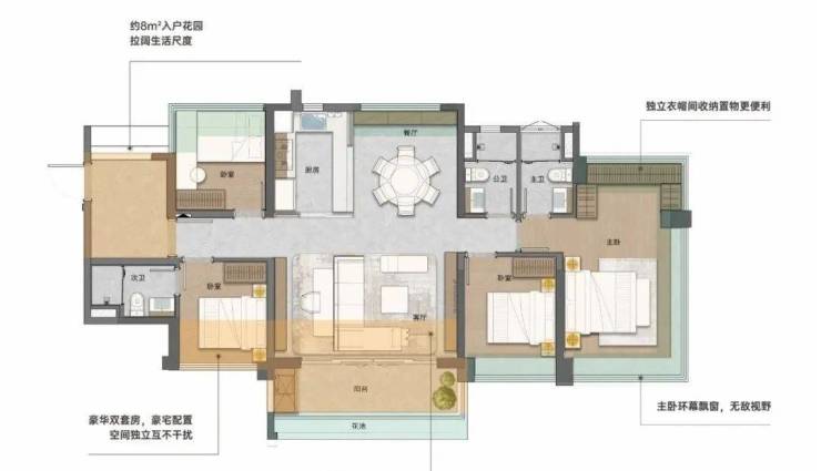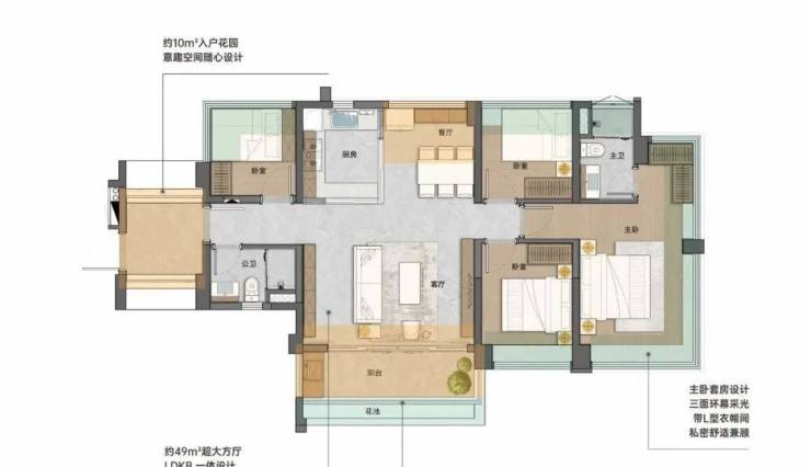 建面130平四房,LDKB大方厅,客厅就有57平,还做了双主套设计,豪宅的配置互不干扰。