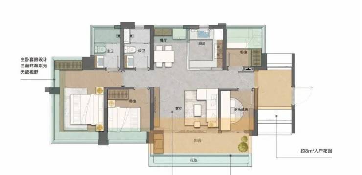 建面89平四房,该户型入户花园约12平,竖厅设计,约6.3米的宽景阳台链接了次卧,还能该做5房。