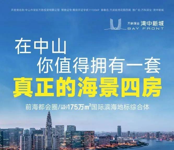 ①滨海地标双塔②中山新客运码头③滨海商务集群④滨水休闲商业街⑤菁英品质教育⑥建面约15万㎡会展中心⑦全系海景住宅⑧灵动办公产品【产品信息】建筑面约69-163㎡滨海临湾美宅,建筑面约220㎡-249㎡一线海景大平层,建筑面积约30-66㎡灵动办公 区位&交通;万科深业·湾中新城择址 马鞍岛腹地,东部临海 与深圳隔海相望。马鞍岛从交通、产业、城市建设等方面对标前海,承接深圳高端产业转移和资源外溢。 【千亿热土】黄金内湾,以约大湾区30%的面积,贡献了超90%经济产值。马鞍岛作为黄金内湾的核心组成部分,把握战略机遇,同时为中山城市价值的制高点,未来城市新中心。