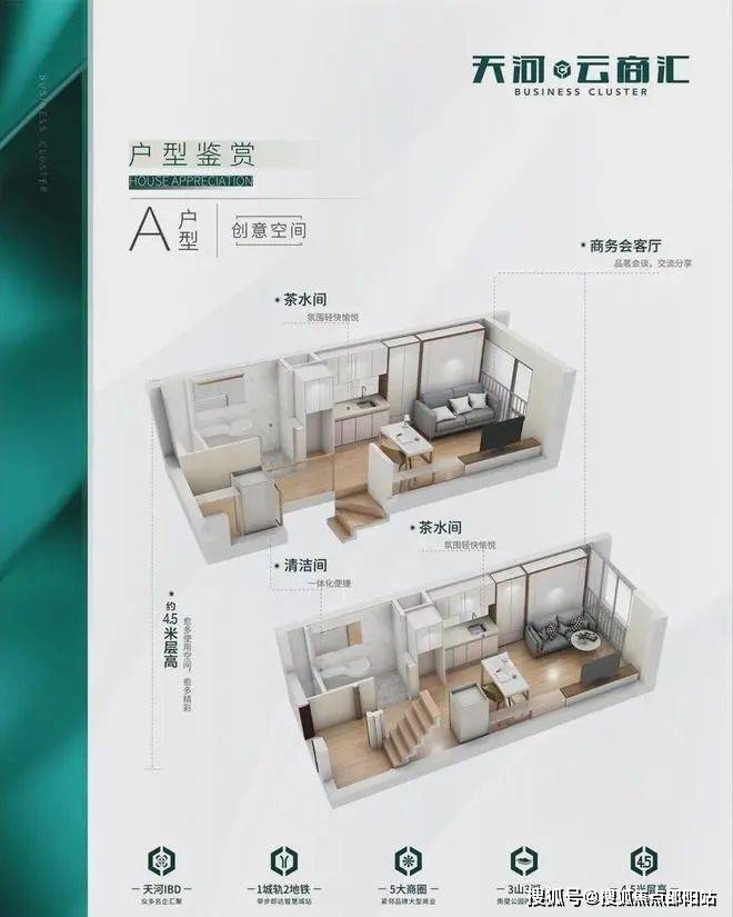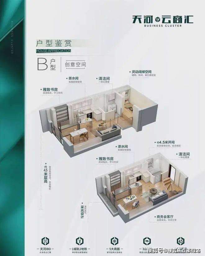 天河云商汇以城芯全能属性诠释一城价值朝向,打造建面约31-58㎡创意空间,挑高约4.5米灵动空间,兼顾休闲、创业、商务、社交等多重功能。私享宽幕观景窗,自在俯瞰一城美景。