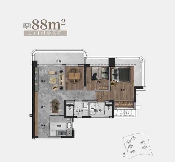 105㎡户型:约6.1米巨幕阳台,主卧全景视野