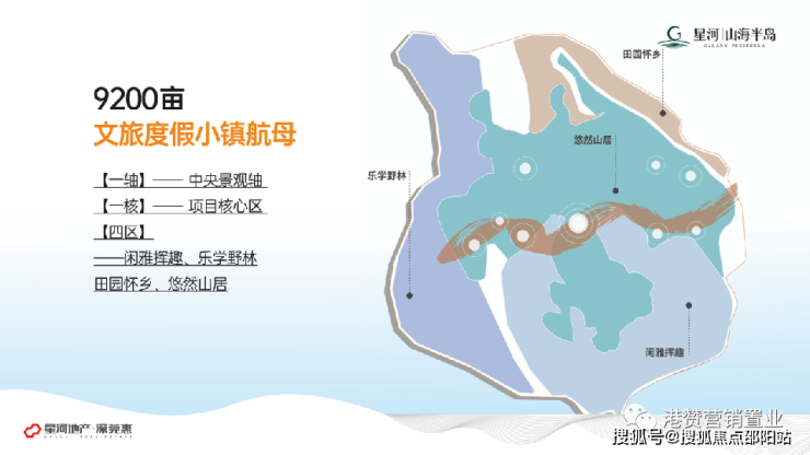 星河山海半岛总占地约9200亩,其中1500亩建设用地,7700亩配套设施用地。项目总规划配套按照分区空间规划划分,可分为【一轴】——中央景观轴,【一核】——项目核心区,【四区】——闲雅挥趣、乐学野林、田园怀乡、悠然山居。