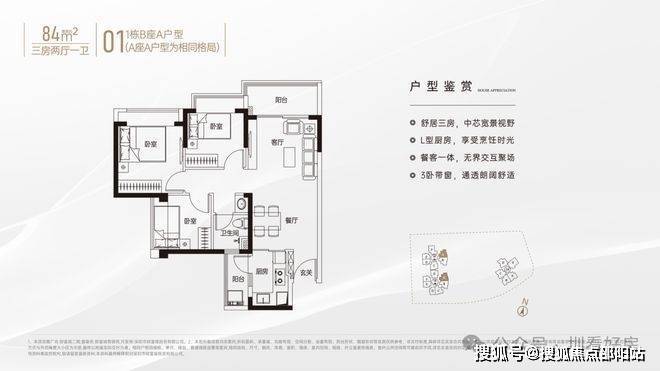 竖厅格局,客厅3.4米开间,LDKB一体化设计,动静分区,L型厨房还带1个生活阳台,卫生间三段式干湿分离,得房率约79%(不含赠送),东北朝向。