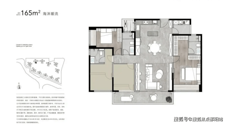 165㎡的 4 室 2 厅 3 卫主打双卫 + 家政间的实用配置,南北通透的格局让室内通风效果较好