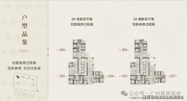 226/227㎡户型特点: 4T3户,均有独立电梯及门厅互不扰; ·8*8.4m大方厅,宽敞大气; ·超款客厅落地景观面,客厅、阳台、众数套房可望 江望琶洲总部及广州塔,景观优势(无主阳台); ·有独立工人房但无赠送平台; ·主卧270°景观转角飘窗,800mm飘窗可打;