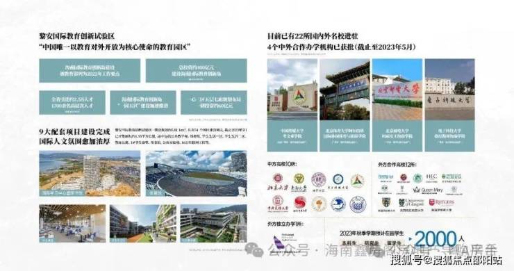 目前,教育园区已成功签约22所国内外知名高校,其中中方高校10所、与中方高校合作的外方高校12所,分别为北京大学、东南大学、南开大学等“双一流”建设知名高校,以及英国格拉斯哥大学、美国莱斯大学、法国巴黎HEC商学院等国际知名高校。其中:北京体育大学阿尔伯塔国际休闲体育与旅游学院、北京邮电大学玛丽女王海南学院、中国传媒大学考文垂学院、电子科技大学格拉斯哥海南学院四所已成功签批。
