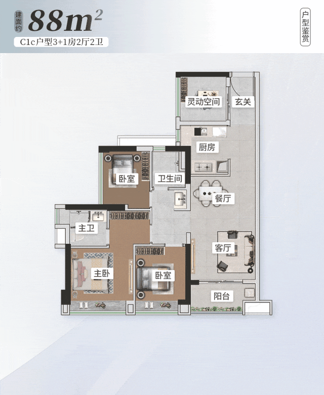 还有约88平3+1房,升级为四个房间的配置,不输新规产品,更为家庭成长预留了空间。