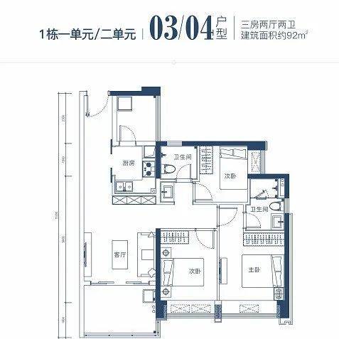 三卧居住空间配置均衡,符合刚需需求,开间进深比良好空间利用充分;
