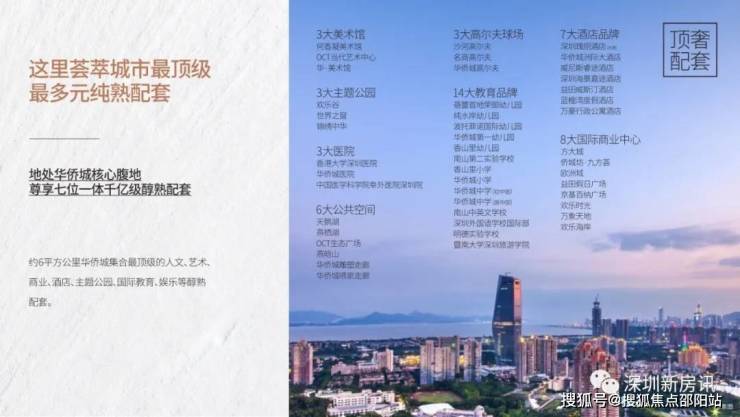 约6平方公里华侨城集合最顶级的人文、艺术、商业、酒店、主题公园、国际教育、娱乐等极致醇熟配套,中心繁华举步即达。