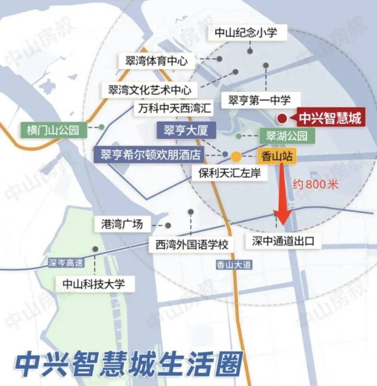 中兴智慧城懿禧府:项目是离深中通道出口仅800米,是深中通道桥头堡项目,更是真正的地铁上盖物业,东瞰伶仃洋,西望翠湖公园,南北由茅龙河水域大面积覆盖,拥有海景、湖景、江景三面环绕的滨水景观和三面环公园的生态环境。中山未来最具人气的沙滩公园最近的唯一项 目,更能近距离感受270米深中通道主塔地标性景观,以后世界打卡的地标,是你窗前的风景。更有世界级TOD香山站,让你的物业价值独领人才岛!