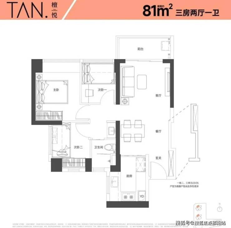 81㎡的3房2厅1卫采用了竖厅设计,进门处设有入户玄关,客厅开间达到3.5米,并采用了LKDB一体化设计,实现了动静分区的布局。其中一个次卧设计了双飘窗,厨房为U型设计,卫生间则采用了三段式分离设计,得房率为74.34%(不含赠送),朝向为西北。