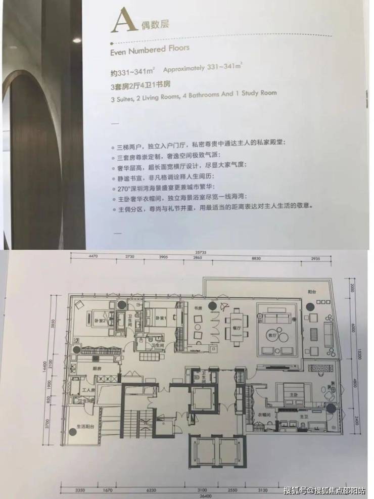 A 户型:3 套房 2 厅 4 卫 1 书房
