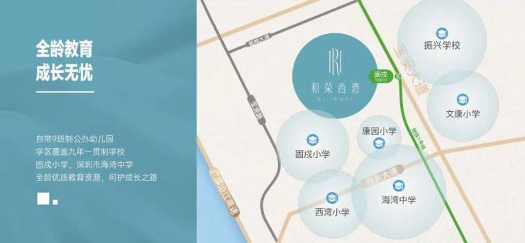 项目自带9班制公办幼儿园,学区覆盖九年一贯制固戍小学、深圳市海湾中学,启航精英人生路