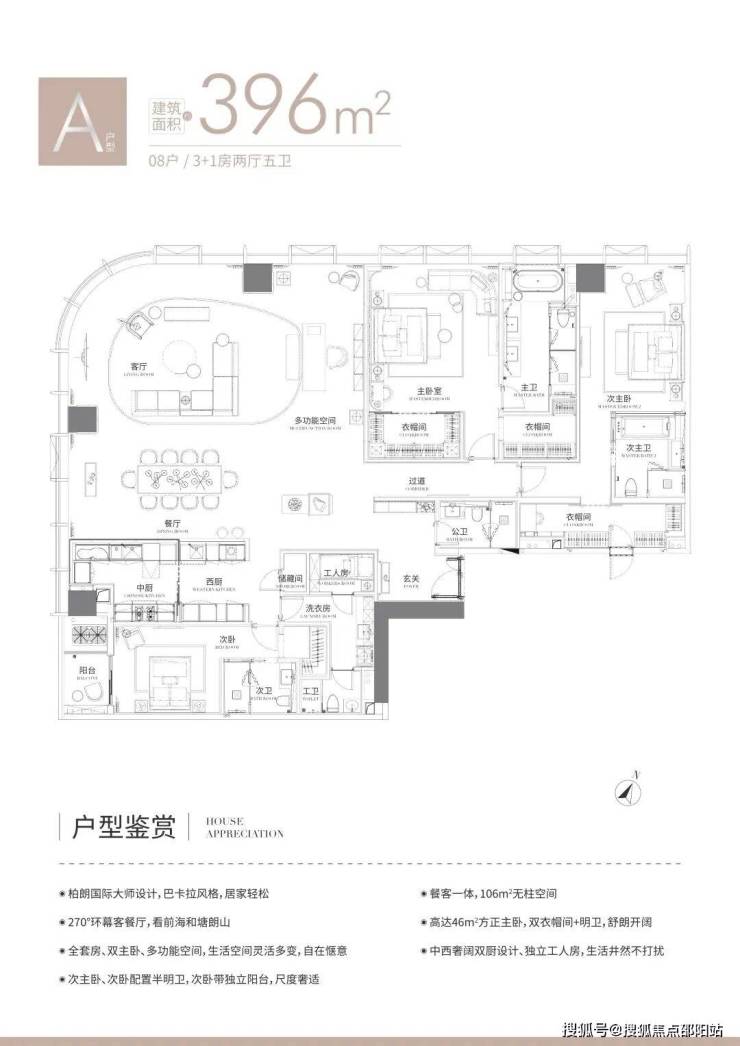A户型:396㎡,3+1房2厅2厨5卫,西北向,全套房双主卧,次卧带阳台