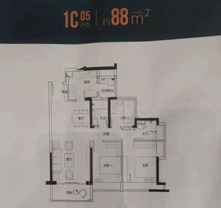 88㎡的3房2厅2卫(1栋C座05户型),设计的是竖厅格局,客厅3.8米开间,动静分区,三开间朝南,主卧大套间设计,L型厨房,还带1个生活阳台,得房率:77.27%(不含赠送),阳台东南朝向。