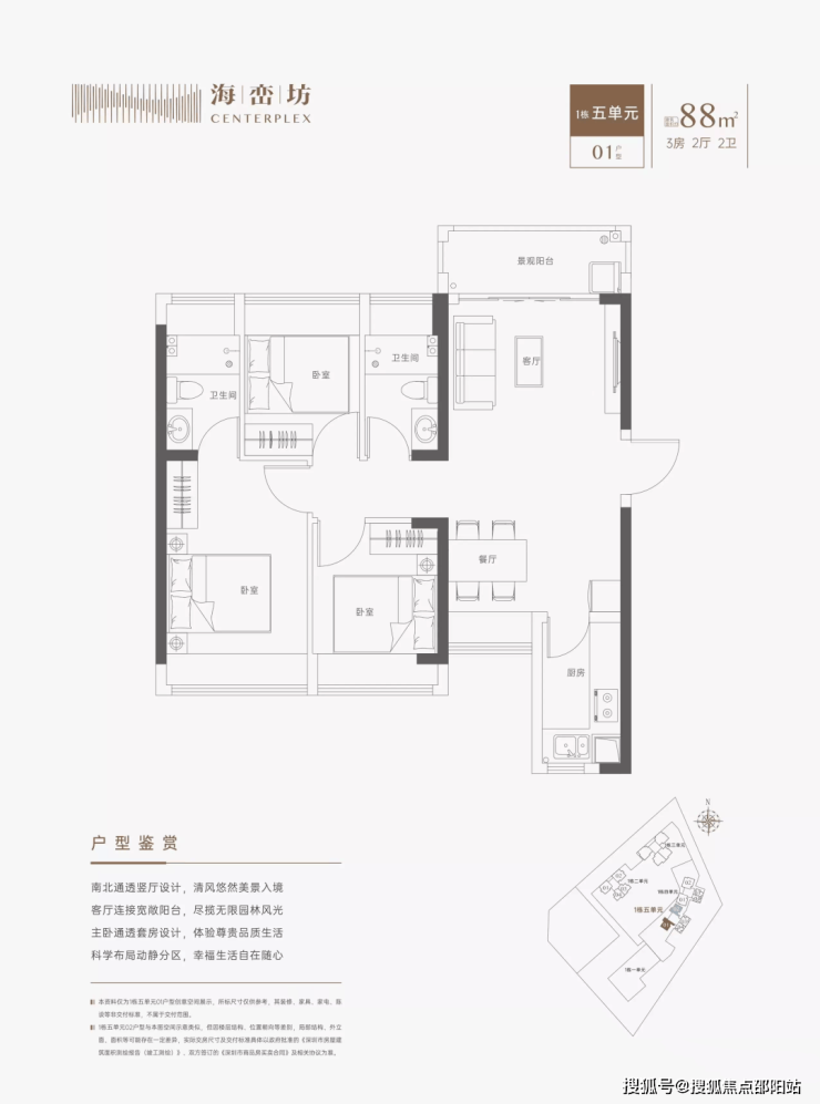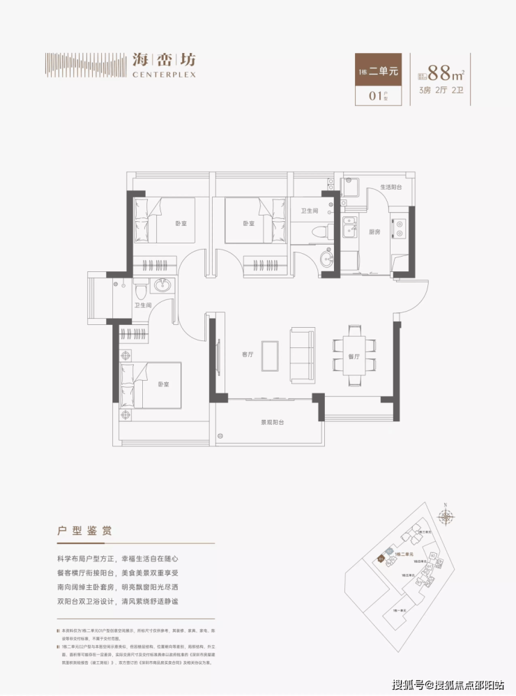 第三个户型紧凑实用,52平就能做两房,88平方能做三房两卫,而且的话南北通透,户型得房率特别高。