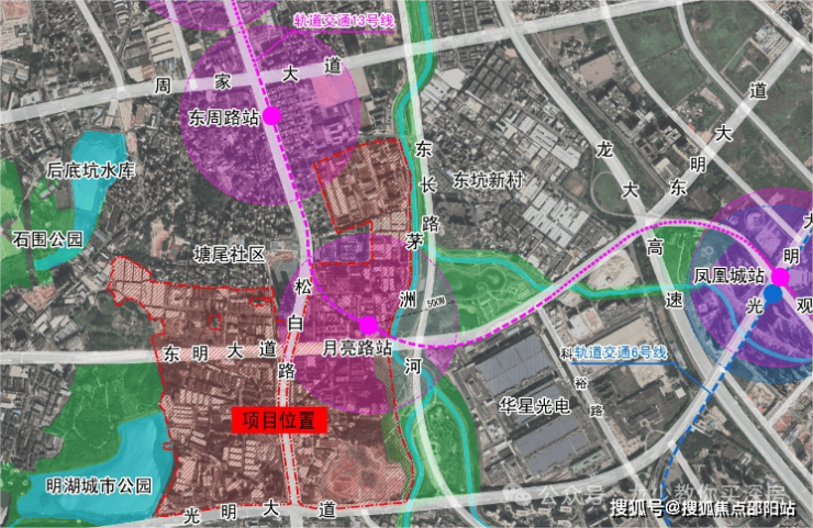 明湖城市公园、鹅颈水湿地公园、东坑水湿地公园已正式开放,茅洲河水岸公园(光明段)也在升级改造中,地铁上盖公园湿地公园、凤凰文体公园在建中,6个公园共约200公顷,距离也都在1公里范围左右。其中凤凰文体公园上规划博物馆,城市展厅及文体场馆等配套。