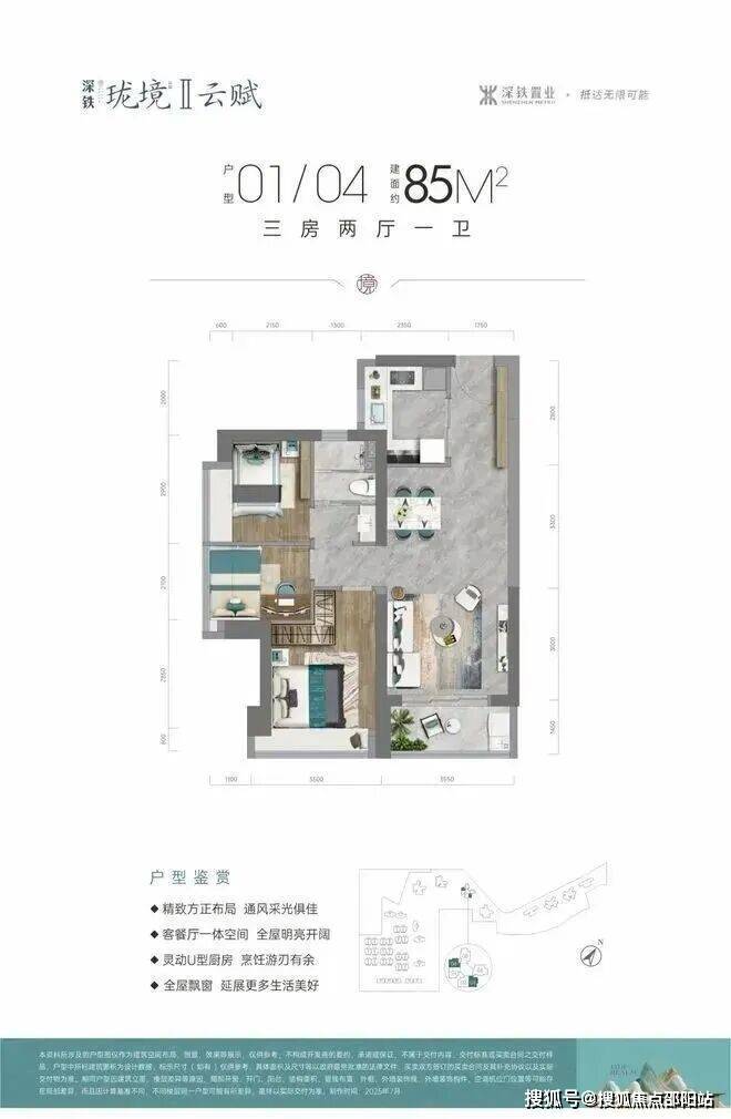 竖厅格局,进门入户玄关,客厅3.6米开间,LDKB一体化设计,动静分区,U型厨房,卫生间三段式分离,得房率约75.4%(不含赠送),西南或东南朝向。