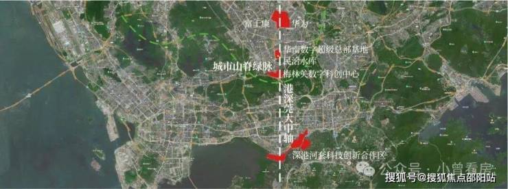 ④深圳发展中轴,华南数字超级总部基地、星河world总部基地、坂雪岗科技城、北站产融结合示范区、梅彩新一代信息科技,连成深圳中轴含金量置顶的价值金线。