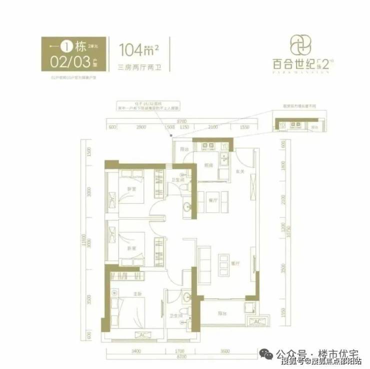104㎡的3房2厅2卫,1栋02/03户型,设计的是竖厅格局,客厅3.6米开间,LDKB一体化设计,三开间朝南,动静分区,得房率约76%(不含赠送),正南朝向。套内面积79.04㎡+赠送10.31㎡=实得89.35㎡,加上赠送得房率约85.91%。