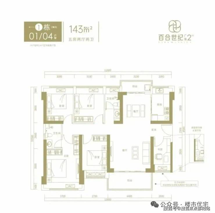 143㎡的5房2厅2卫,3栋1单元04/3栋2单元01户型,设计的是竖厅南北通透格局,进门入户玄关,客厅4.4米开间,客餐厅分离设计,南北双阳台,得房率约76%(不含赠送),阳台主朝西南或东南向。套内面积108.68㎡+赠送17.22㎡=实得125.9㎡,加上赠送得房率约88.04%。