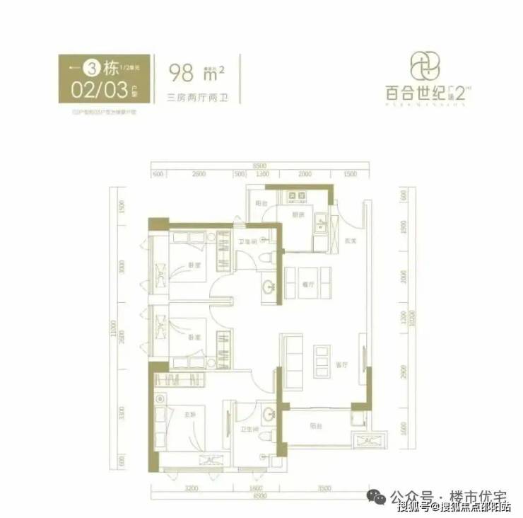 98㎡的3房2厅2卫,3栋02/03户型,设计的是竖厅格局,进门入户玄关客厅3.5米开间,LDKB一体化设计,三开间朝南,动静分区,得房率约76%(不含赠送),正南朝向。套内面积74.48㎡+赠送9.05㎡=实得83.53㎡,加上赠送得房率约85.23%。