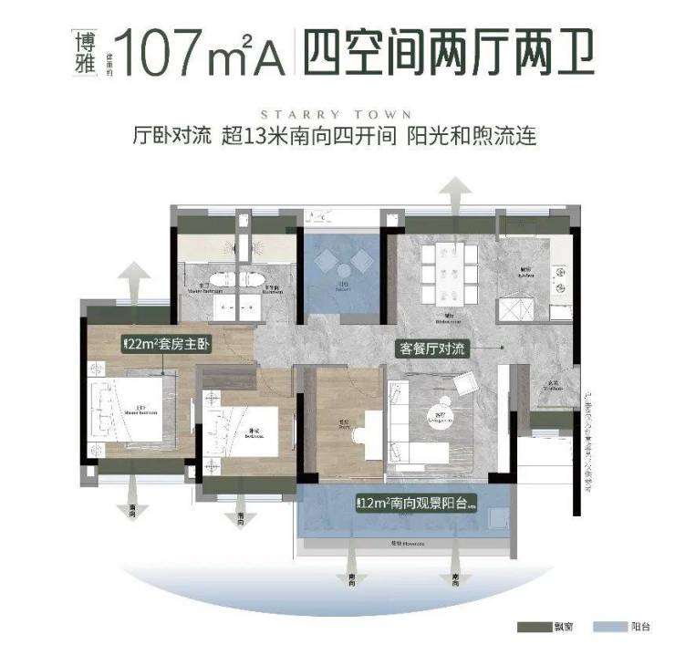 107㎡A 4空间2厅2卫,4.5 开间朝南,客厅主卧双南北对流,5.9米长观景阳台!交互式方厅,可开可合