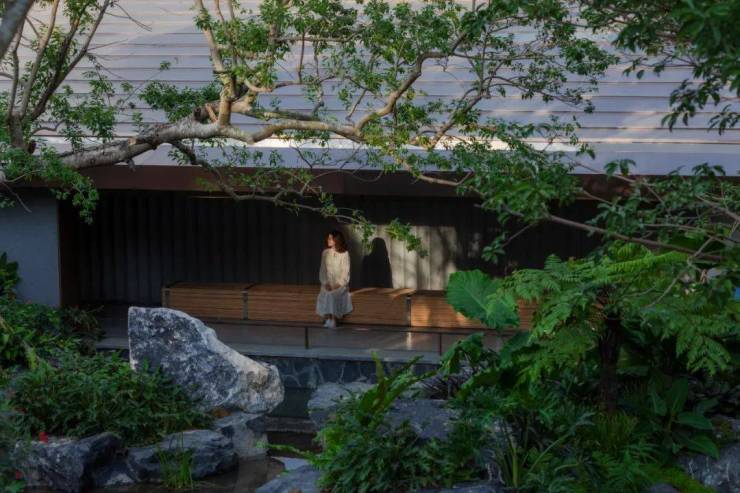 当我们第一次踏足这里的时候,清水湾的绵长沙滩和山海间的情愫深深地吸引着我们,路旁成片的槟榔林与林后的村落给我们留下了很深刻的印象,于是便有了一个隐藏在一片热带棕林背后的住区入口、雨雾弥漫的热带雨林、阳光透过的成片椰林、草阶模仿出海浪等等体现海南当地地域特征的空间设计。