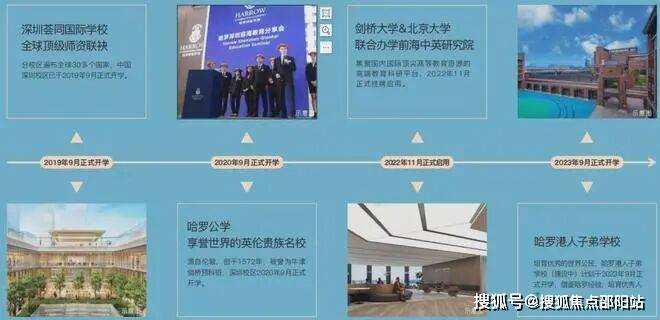 世界著名学校英国哈罗公学(已开学)、哈罗港人子弟学校(在建中)、美国荟同国际学校(已开学),以及剑桥大学&北京大学联合办学前海中英研究院(已开学)