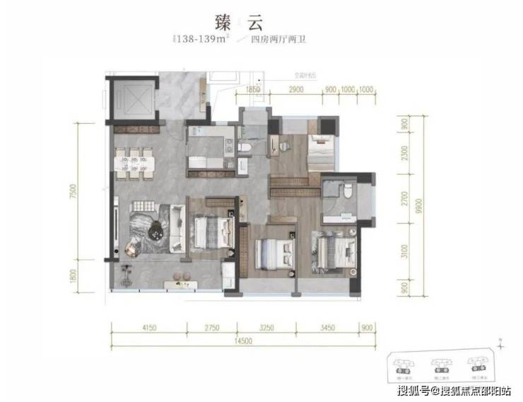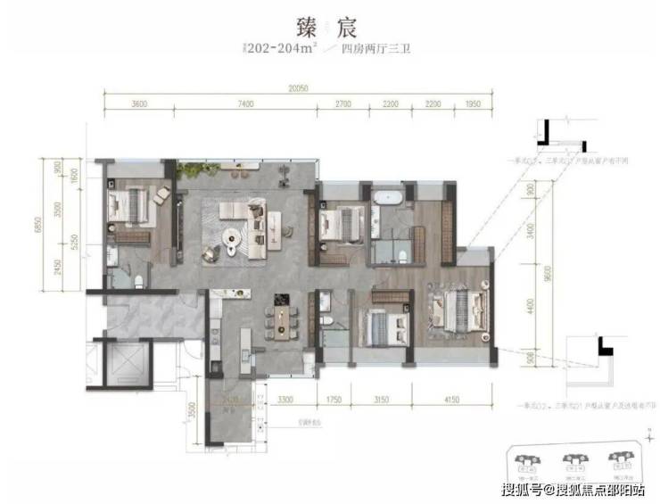 【产品户型】:建面约202-204㎡四房两厅三卫