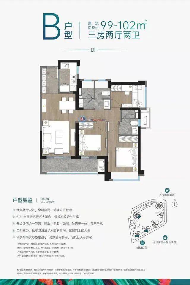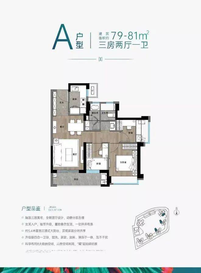 户型分布,79-81㎡的3房1卫朝向为西南向,99-102㎡的3房2卫作为主力户型朝向为正南向,而112-115㎡的4房2卫的大户型朝向为南北通透。
