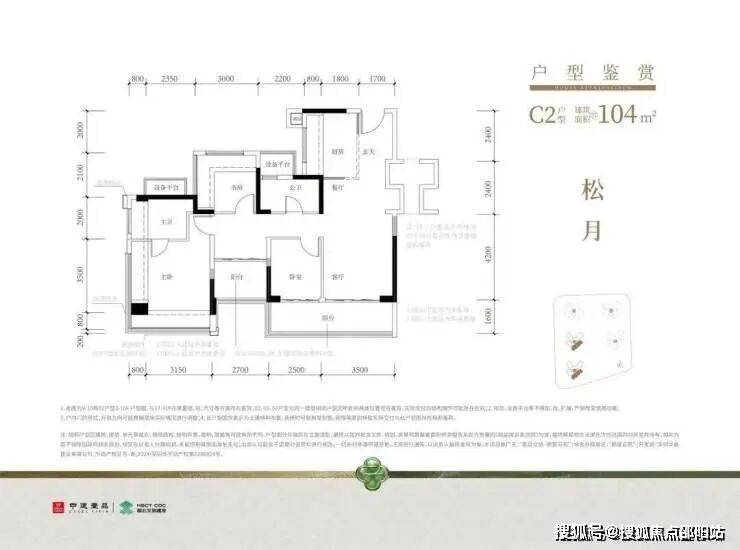 户型面积布局C2104平四房两厅两卫设计的是经典竖厅格局,进门入户玄关,客厅3.5米开间,LDKB一体化,S墙设计预留冰箱卡槽位,动静分区,四开间朝南,分别做到了主卧17.98㎡/次卧8.37㎡/次卧8.1m²/次卧7.75㎡(包含墙体飘窗),L型厨房,公卫干湿分离带1个约2m²的设备平台,得房率约79.2%(不含赠送),客厅连接次卧出9.6m²的观景大阳台,东南或西南朝向。套内面积82.58m²+赠送面积23.86m²=实用面积106.44m²,加上赠送后得房率约102.04%。
