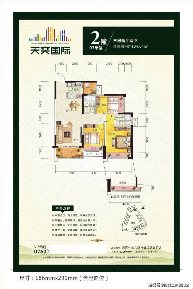 天奕国际广场,雄踞中山城市东,即中山路与生态中轴长江路交汇处;更毗邻城市“绿肺”——紫马岭公园,随着城市向东发展的进程加快,城区中山路沿线物业,首期住宅组团将推出,80-122㎡的二房、三房单位,尽享东区CBD核心区的商务繁华、休闲娱乐购物、优质教育医疗、生态居住等最极致的生活资源。