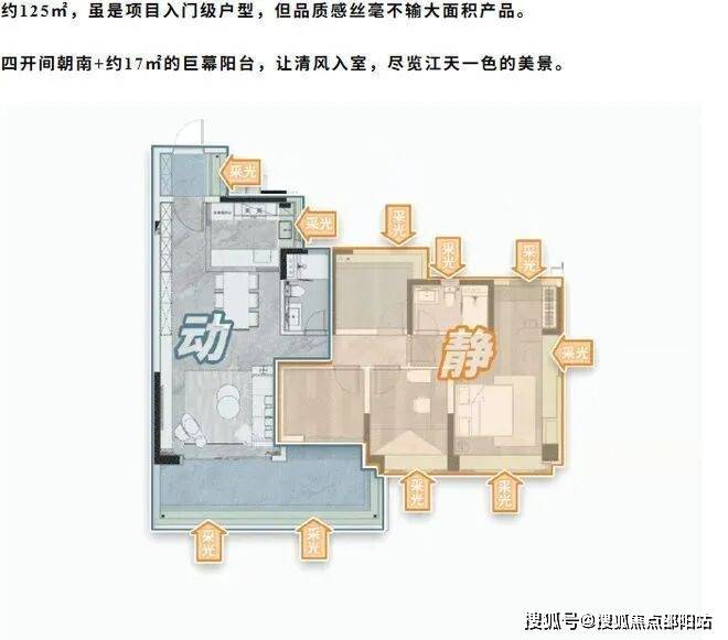 [户型使用率高达103%]、[4面宽朝南看江]、[阳台宽达2.2米,长度8-9米]