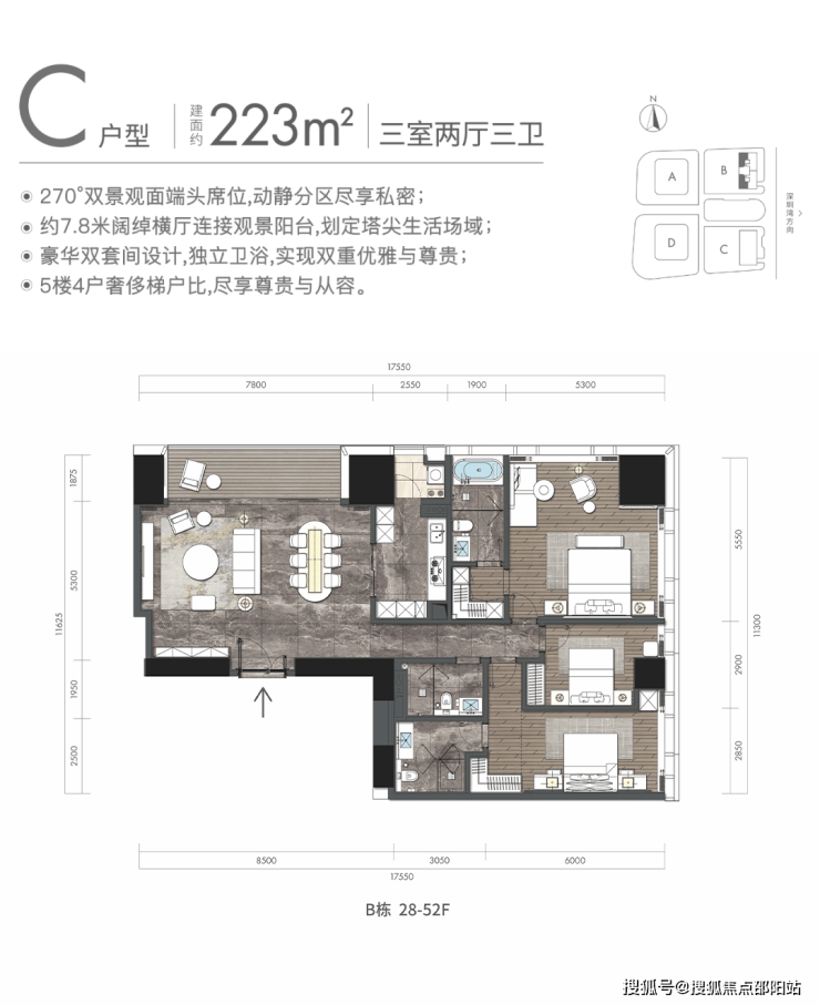 项目全盘无小户型,起步户型即为建面约160㎡的大户型,最大户型达580㎡的云端藏品。这种纯粹的大平层规划,直接筛选了极具实力的塔尖圈层。同时,项目通过270°环幕阳台设计,部分户型拥有长达23米的景观面,将深圳湾的壮阔海景与城市繁华无死角地引入室内,重新定义了深圳顶豪的居住标准。