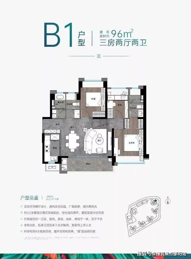 户型分布,79-81㎡的3房1卫朝向为西南向,99-102㎡的3房2卫作为主力户型朝向为正南向,而112-115㎡的4房2卫的大户型朝向为南北通透。