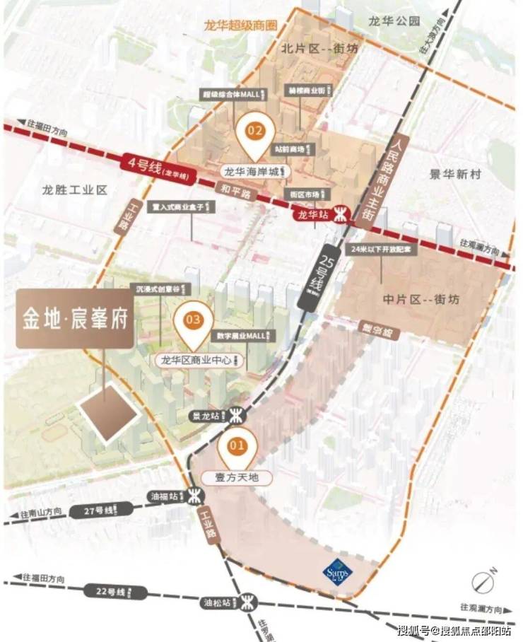交通方面:位于龙华多条地铁线交汇处,地铁 4 号线龙华站及 6 号线上芬站举步即达,规划中地铁22、25、27号线等站点(规划中景龙站/油福站约400米)就近而设,加上规划中的侨城东路北延线和沙河东路北延线贯通龙华、南山、福田,直抵深圳湾,未来立体交通路网接驳,无界一城繁华生活。