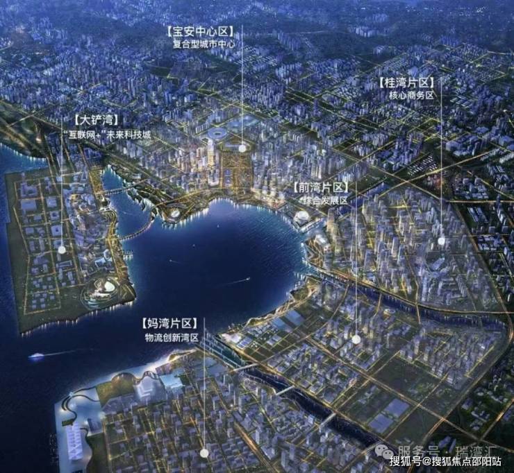 粤港澳大湾区借势国家战略东风高速发展,前海宝中占据其发展核心,构筑"一湾、两山、五区、四岛”空间结构。