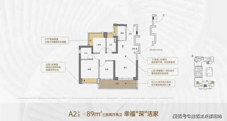 A2户型-约89㎡3房2厅2卫:户型分布在1、2、5单元,阳台南向、东向、西向均有选择。