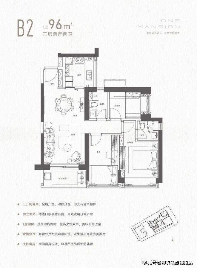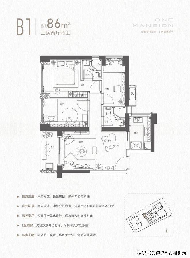 设计的经典竖厅格局,客厅3.6米开间,餐客厅一体化设计,三开间朝南,3个卧室分别做到了3.3米/2.9米/2.7米的宽度,L型厨房,得房率85%(含赠送),东南朝向。