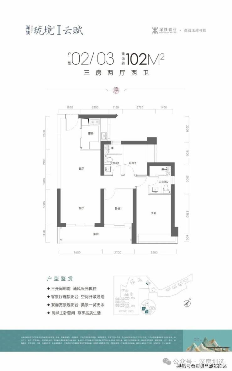 项目核心信息方面,深铁珑境Ⅱ·云赋充分利用地形高差,规划为容积率较低、楼栋错落有致的围合式社区,最大程度保证景观视野与居住私密性。产品定位为精致改善,主力户型聚焦于功能性升级与居住舒适度,提供建面约110-180平方米的阔景三房至四房。户型设计强调空间的功能分区与景观面延展,通过大面积玻璃窗、观景阳台等设计,引景入室,部分高层单位可远眺山景或城市景观,提升居住的愉悦感。