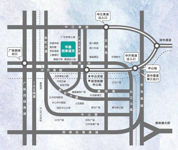 中山华盈·四季蓝天 项目东面就是深中通道始发站高速口,走深罗高速直驳深中通道,半小时到深圳,走中江高速上广珠西线,往北广州往南珠海,都在40分钟内。到2019年还可以走中开高速去开平茂名。项目离中山城轨北站仅5分钟(深中通道从第三出口驶出,通过中江高速港口出口下高速,车程约5分钟到项目),坐广珠轻轨去珠海和广州都非常便捷,港珠澳大桥直达香港澳门。 华盈·四季蓝天 项目地处西区彩虹片区,享12万㎡城熟配套,东南方向1.5公里处为广珠城轨中山北站;揽括主城西、北区生活配套,构成中山未来核心居住区(江北新区CLD)的发展重点。 华盈·四季蓝天项目周边商业配套成熟, 天悦城、远洋一方新都会、麦德龙超市、迪卡侬、五月花影城、壹加壹超市等,5分钟即享城市醇熟配套。 华盈·四季蓝天项目周边 的奥园幼儿园、吉的堡幼儿园、西区中心小学、奥园小学等,形成了成熟的教育配套。 华盈·四季蓝天项目周边不仅有国家三甲中医院—— 中山新中医院为健康保驾护航;更有沙朗市场、彩虹市场、彩虹绿洲公园、广丰体育公园环绕,自然环境以及健康生活触手可及,市政配套教育娱乐一站式完善需求,生活氛围浓厚。 咨询热线;400-0961-568 华盈·四季蓝天拥览7000㎡罗汉松璀璨园林,中央无边际泳池、大气景观广场、休闲运动广场、儿童游乐园,移步换景,处处怡情,41%绿地率畅享城市公园生活。 华盈·四季蓝天小区 由温暖物业管理有限公司管理,小区24小时酒店式管理,智能安防,专层智能消防门禁系统,整个小区人车分流,车库出入口启用自动识别车牌系统,360度全方位保障业主安全。华盈四季蓝天71-113㎡城中稀缺户型约71㎡小两房户型约87㎡小三房户型