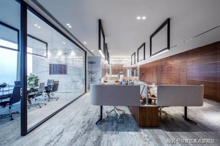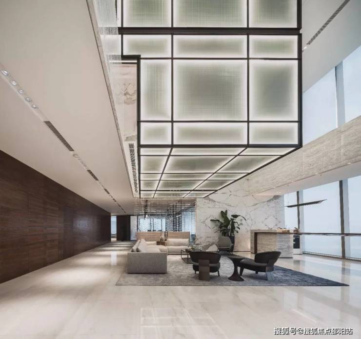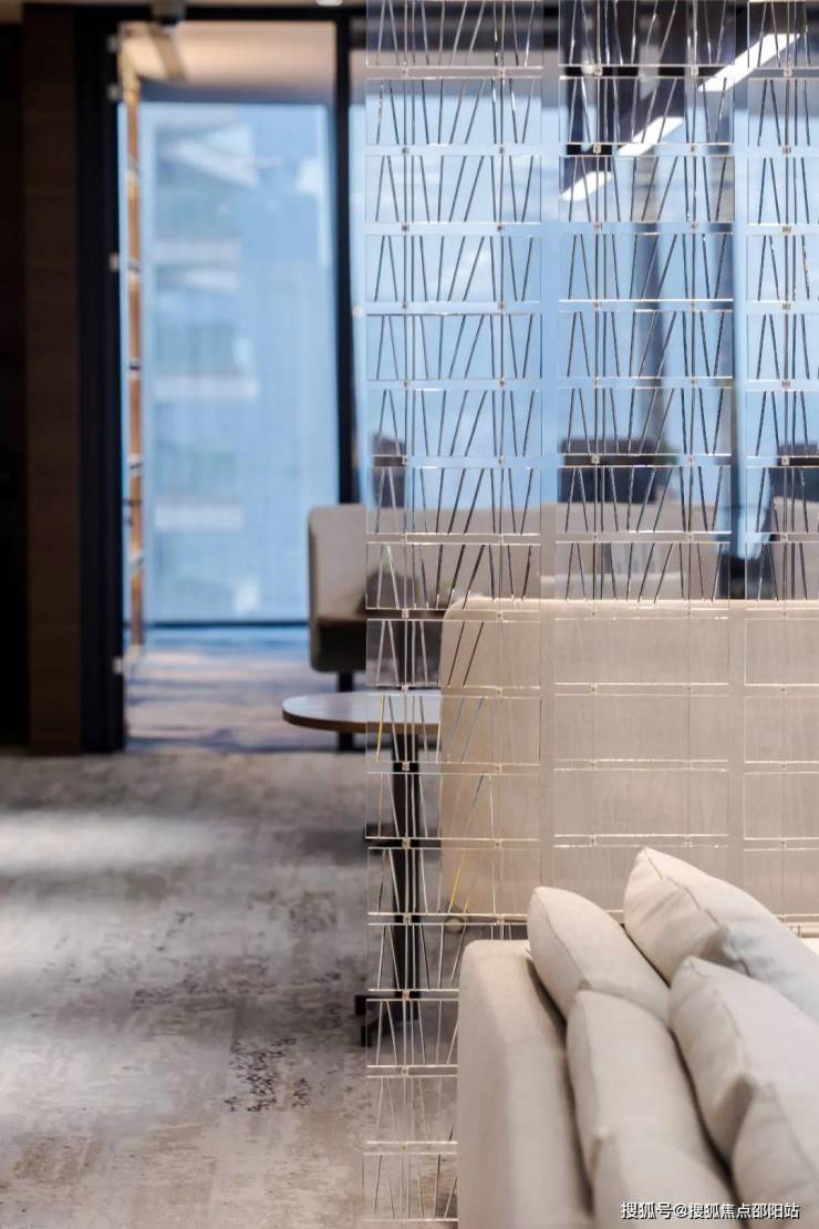 办公展示中心位于塔楼的27层,总面积550平方米,建筑层高4.5米,净高办公空间3.2米,拥有两米宽幅的玻璃幕墙和滨海长廊自然景观。展示中心包含两层通高的接待中心、会客区、办公区、会议室、经理室、阅读区及工法展示区,为用户展示交互式工作场所,鼓励交流与互动。透明的“墙”模糊了空间的功能边界,提供了一个便于随意沟通与互动的空间体验。