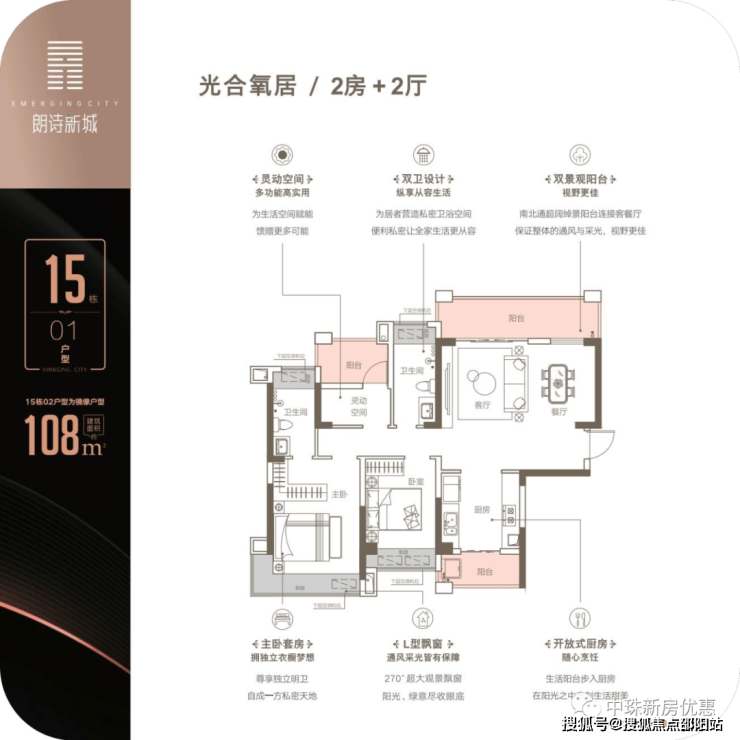 ⑤建面约108㎡三房两厅两卫,南北通透,阔景大阳台,动静分区,全优户型。