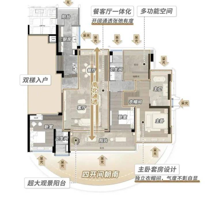 另外这个户型的亮点也有不少,比如双梯入户、南北对流、超大景观阳台、四开间朝南等。